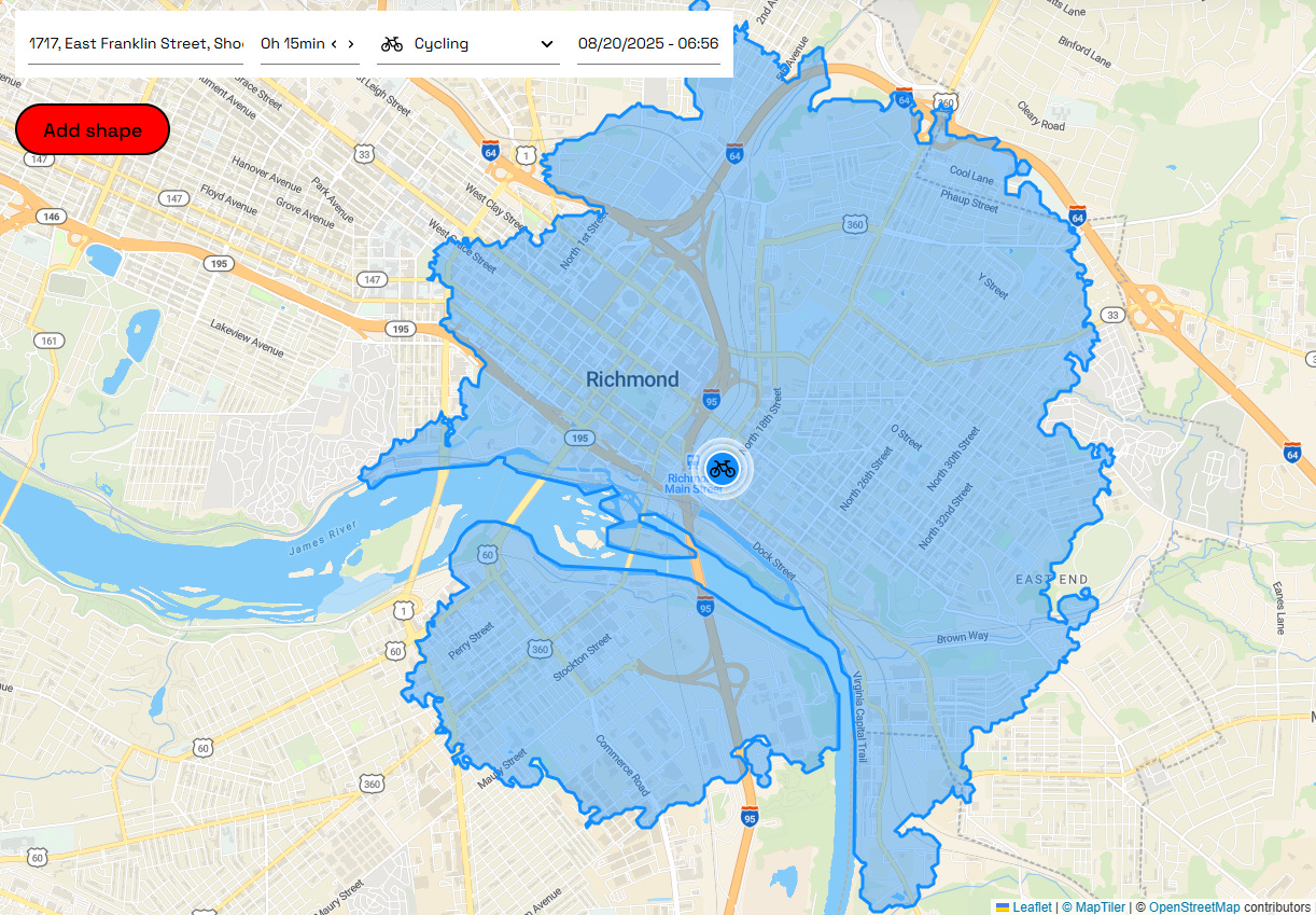 How far can you go in X minutes? What if you’re riding a bike instead of driving? There are several of these free travel time map tools, but the core idea is the same. Let’s say you work in economic development and you want to see what visitors to Richmond, VA can discover within a 15-minute ride of Main Street Station using bike share. Easy peasy. You can add shapes for different modes and trip times. It’s a great way to visualize what’s within reach when getting around town using the bus or a bike.