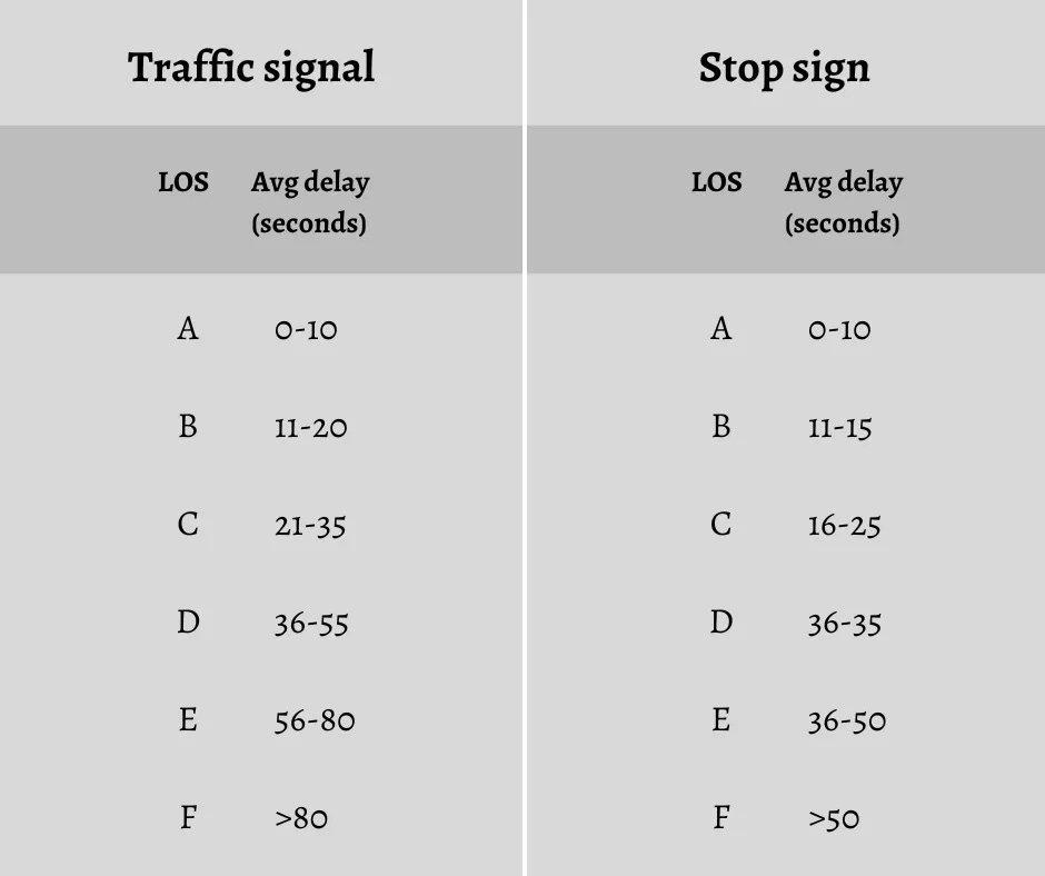 Take a look at this table that status quo planners and engineers use to measure an intersection’s performance.